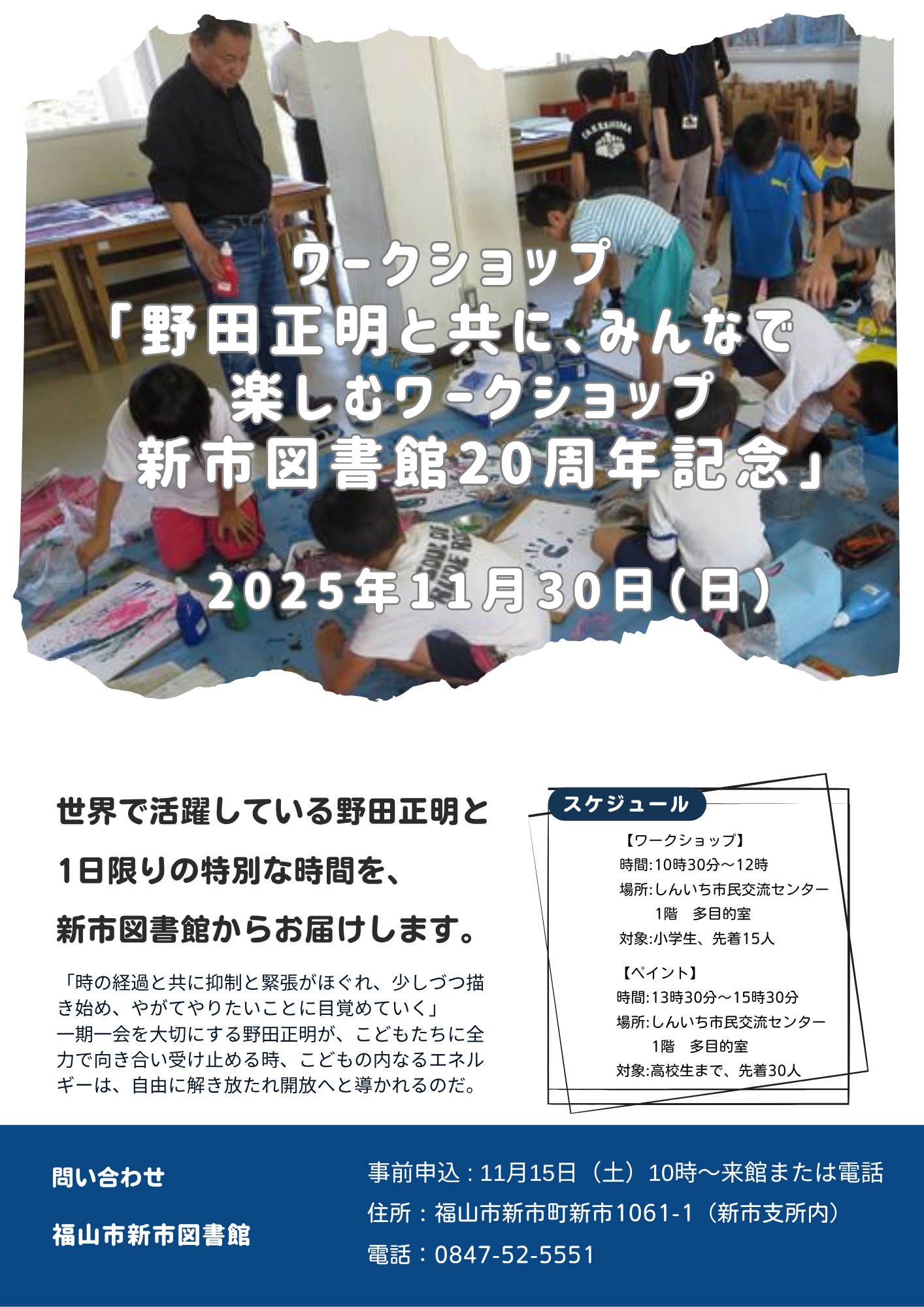 〇新市図書館20周年記念「野田正明とともに、みんなで楽しむワークショップ」